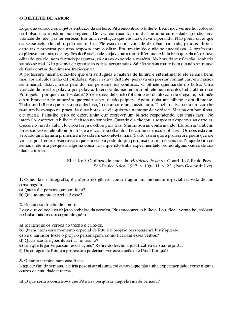 O título do poema transmite o seu propósito. Steve Grill Estrelando Anne Whitney Craig Bierko Jo Lemon Laura Donnely Rick Boynton Rick Meads Sally Murphy Tom Rolund - Sinopse. I Leia o conto O bilhete do amor de Elias José. Leu ficou vermelho colocou no bolso não mostrou pra ninguém. Logo que colocou os objetos embaixo da carteira Pitu encontrou o bilhete. O Bilhete do Amor. Para gostar de ler v. Logo que colocou os objetos embaixo da carteira Pitu encontrou o bilhete. O BILHETE DO AMOR Logo que colocou os objetos embaixo da carteira Pitu encontrou o bilhete.